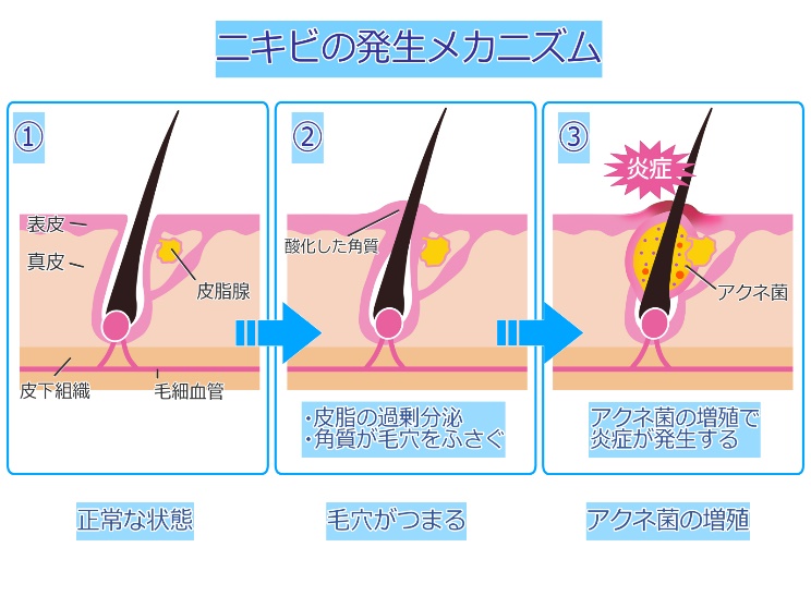 ストレスやホルモンなどの影響で皮脂腺が活性化すると、皮脂の過剰分泌が起こり、過剰な皮脂は毛穴を詰まらせ、出口を塞がれた毛穴の中では皮脂が溜まっていきます。皮脂を養分とするアクネ菌が増殖することで毛穴の中では炎症が起こり、化膿が生じることでニキビになります。